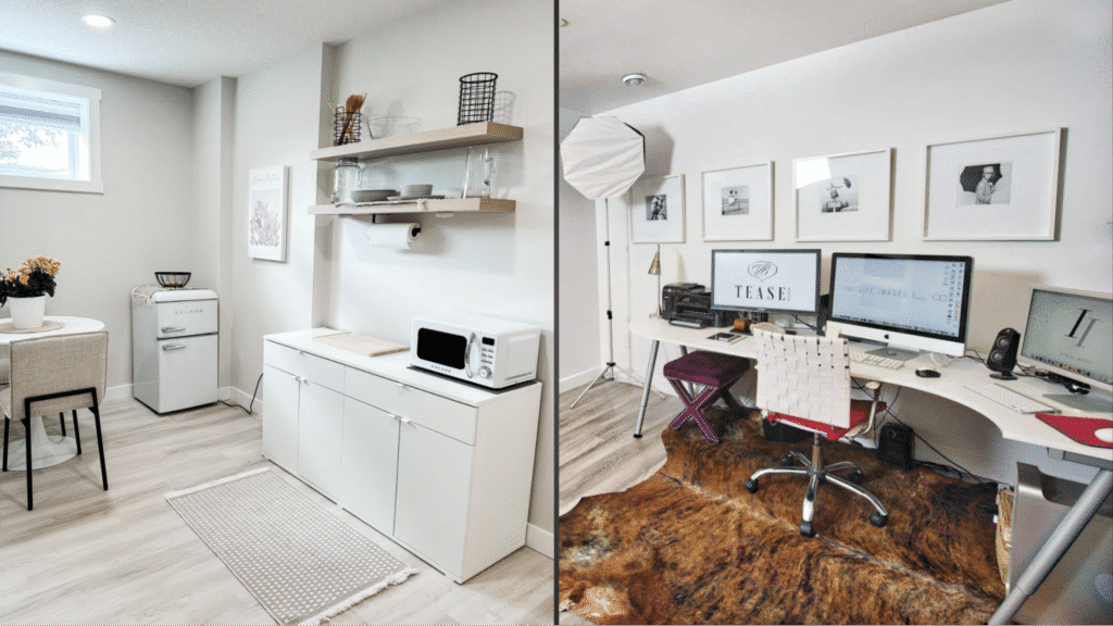 Picture this: a once-forgotten basement transformed into a smart, triple-duty haven. Imagine a sleek guest suite with a fold-out wall bed that tucks away when not needed. Add a compact wet bar with on-trend matte black fixtures, perfect for entertaining without hauling drinks upstairs. And why not include a kids’ craft nook that disappears behind custom cabinetry when company comes over?